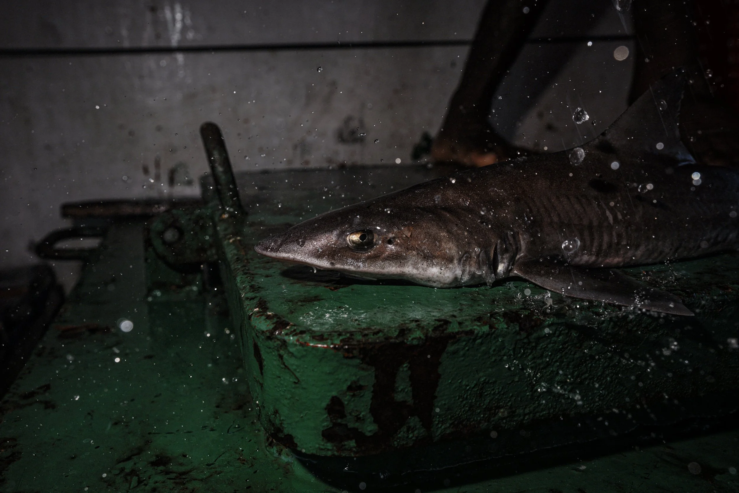 Benjamín González, co-founder of Guardianes Del Mar, removes lead weights from a recently recovered ghost net. The reclaimed metal is later melted down and repurposed into new diving weight belts.